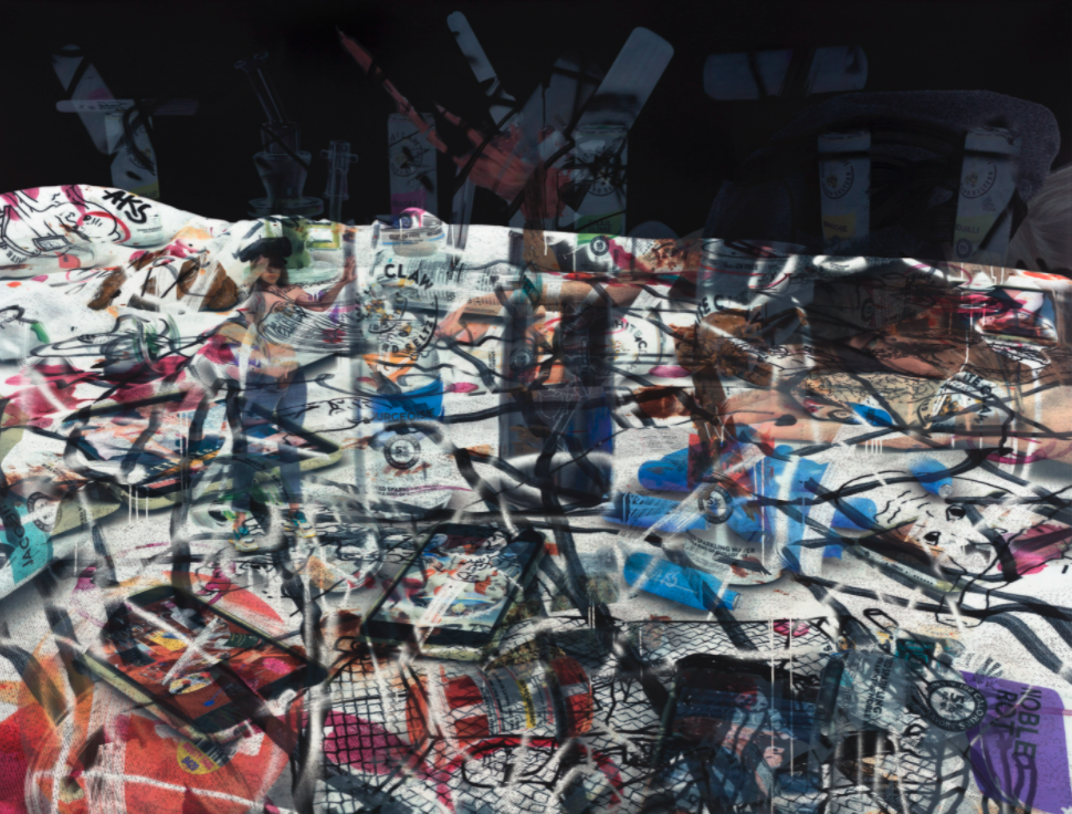 This show, titled Reality Ender, introduces the viewer to a merging of ideas, places, and narratives. As stated by the gallery: “the exhibition invites us to consider form as a state of encounter – an encounter that does not take place with a singular object, reference, or context, but as a conflation of narratives, spaces, histories, and ideas. Singer’s new paintings explore themes – 19th-century European painting motifs, romantic notions of intoxication, stereotypes surrounding the bohemian artist, and icons of contemporary digital culture – that amalgamate past and present, clarity and ambiguity, and propose an escape from our quotidian reality.” In addition, Singer’s new work shows combinations of digital and analog processes through layering: “The artist’s complex process of layering begins with finely primed, gessoed canvas, onto which images are projected before being methodically developed with airbrushed acrylic paint and liquid rubber. The rubber is used as masking solution in a lot of Singer’s paintings, allowing parts of her imagery to be visibly and vigorously removed, effectively unveiling the complex dimensionality that constitutes the numerous layers of each work. Through these diverse methods, Singer continues to challenge the limits of the medium and develop her own way of seeing.”