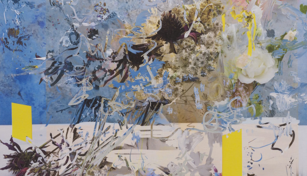 Although Cortright has generally appropriated images and cues from the web, this is the first in a series where she has generated all of the material and subject matter herself. While this might not surprise you to hear that an artist sketched or photographed their subject matter, it is an interesting shift for Cortright. Per 1301PE’s press release, Cortright began this body of work by photographing the blooms in her garden. The results are bold, detailed, abstracted bouquets. Some are done in soft grey and blue, while others burst forward with vivid color and contrast. The most obvious reference would be of that to certain Dutch and Flemish still life painters (the gallery name checks Rachel Ruysch.) However, Cortright certainly didn’t produce these pieces with oil paint and stretched linen canvases; the artist used programs like Photoshop and developed different tools and brushes to create the still lives. The most interesting aspect of these works is not solely their surface-level imagery, but instead it is the tension between the image (historic) and production (contemporary.)