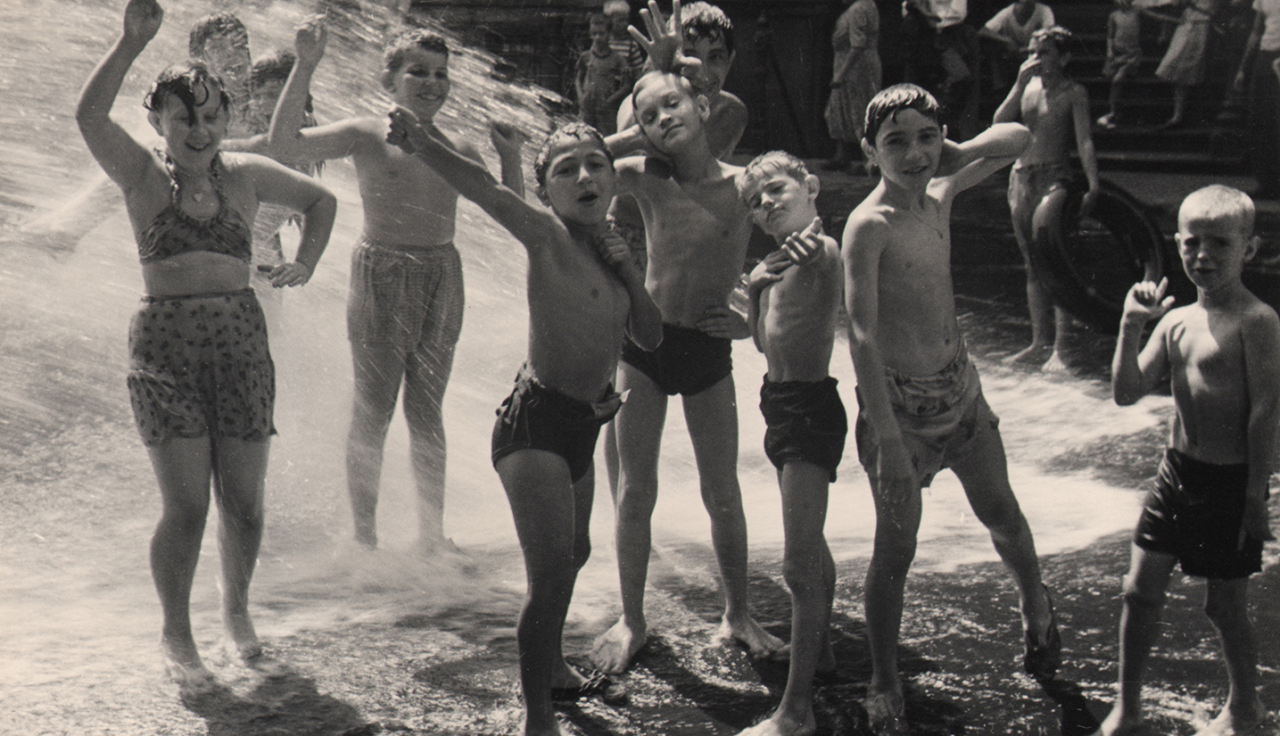 Some of the featured photographers focused on Manhattan’s architecture and landmark sites. Other artists, instead, captured the soul of the city through its inhabitants. Jeanne Ebstel, in the summer of 1947, photographed a group of carefree children wearing swimsuits as they played in the street with water spraying behind them. Simpson Kalisher’s 1959 photo documents an afternoon in midtown Manhattan as anonymous individuals move about their daily lives. Eugene Smith’s series, As Through My Window I Sometimes Glance, observes the everyday goings-on outside his loft window. Unknowing pedestrians struggle to navigate snowy sidewalks as Smith photographs from above. “These are from 1957 to 1958. He (Smith) was a Life Magazine photographer, but this work was a little more personal than some of the other photographs that he made that have historical significance,” said de Lellis.