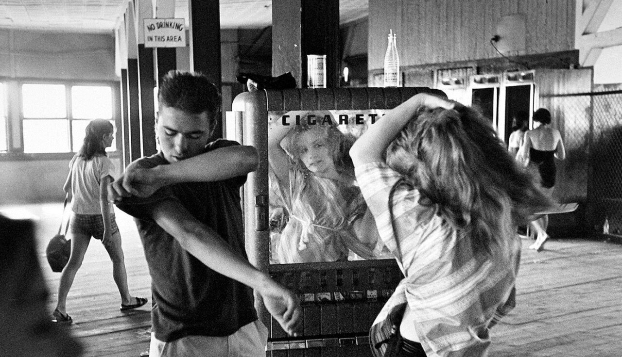 BT: The best-known image in the series, taken in front of a cigarette machine at Coney Island, shows Artie Giammarino, who later became a transit police detective. Cathy O’Neal, whom the boys considered “beautiful like Brigitte Bardot,” is seen here at thirteen or fourteen, around the time she began dating the “coolest” of the gang, Junior Rice. At fourteen, she got pregnant. Though they were both under the legal age, they married but later divorced. Junior became a heroin dealer and user; within a few years, drugs would claim the lives of many in the gang and in the neighborhood. Years after their divorce, Cathy committed suicide by shotgun. Yet we see little hint of that dark future in Davidson’s photograph, which emphasizes Artie and Cathy’s youth and beauty and the pleasure of the moment. To our eyes, accustomed to associating gangs with drug use and gun violence, these images conjure a more innocent era than our own. Viewers in 1959 would have regarded the youngsters’ hairstyles and tattoos, not to mention their underage drinking, smoking, and sex, as ruinously delinquent behavior. Davidson was careful not to pass judgment in his photographs.